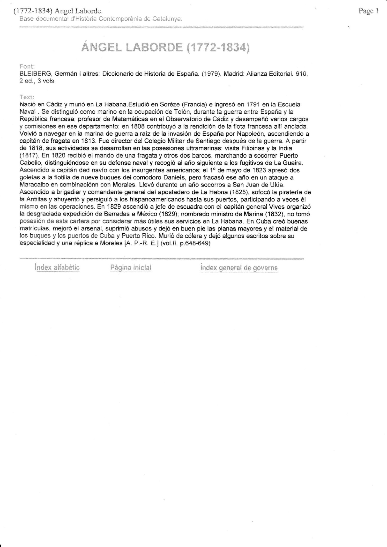 Angel LABORDE (17xx-1791), chef d'escadre et ministre de la Marine d'Espagne