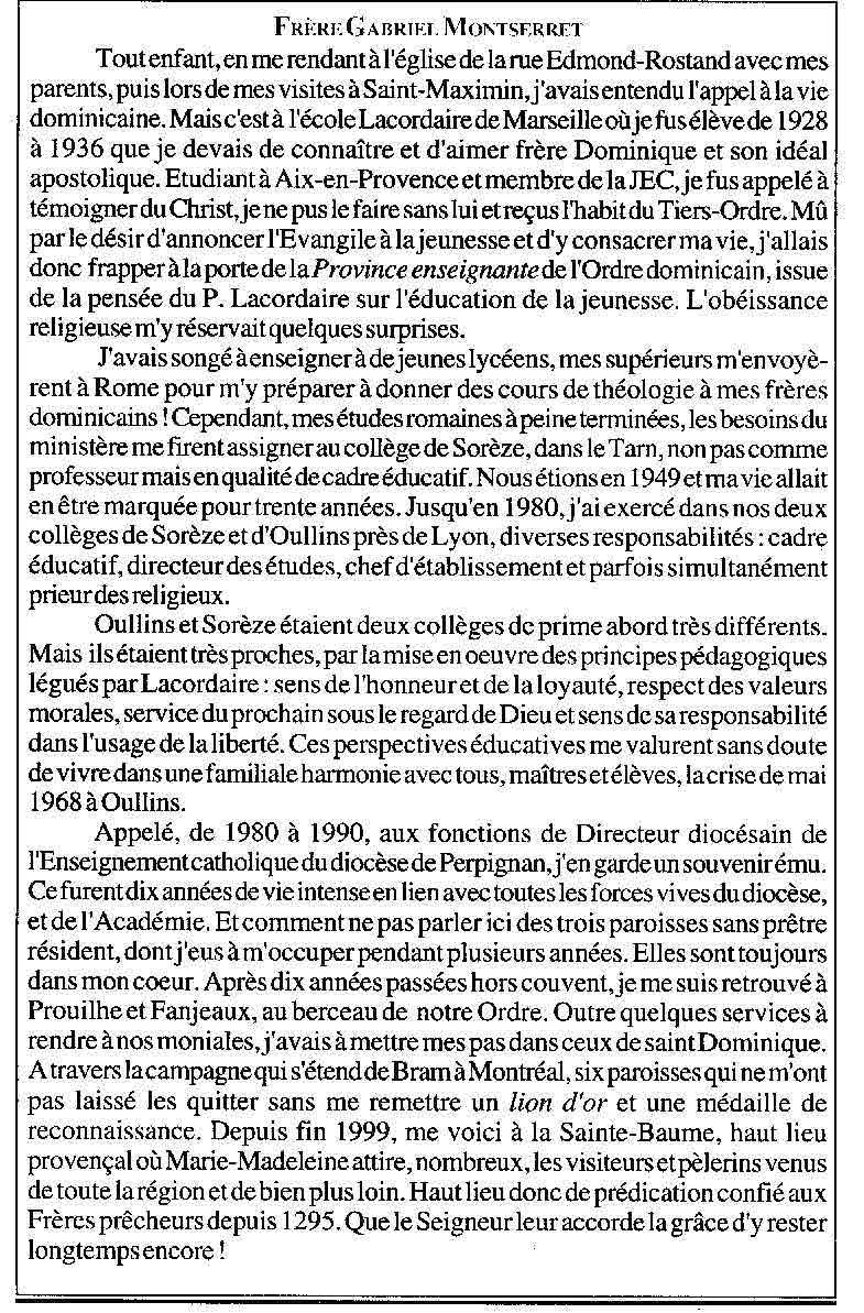 né le 6 juillet 1920 à Marseille, est élève de Lacordaire à Marseille de 1928 à 1936 (Bac à 16 ans), condisciple de 28 à 31 du Père Bernard Dastarac, né en 12. De 1936 à 1948, Il fait des études universitaires à Aix-en Provence, fait partie de la JEC, reçoit l'habit des Dominicains, fait des études de Théologie à Rome pour de se préparer à faire des cours à sa communauté, puis à sa grande surprise, est envoyé à Sorèze comme surveillant des Rouges. Il est à Sorèze de 1948 à 1978 où il occupe différents postes, dont celui de Prieur de 1957 à 1966, puis Directeur de 1974 à 1978, et entre les deux périodes, Directeur de St Thomas d'Aquin, à Oullins, banlieue de Lyon. En consécration de son œuvre pour Sorèze, Il reçoit la légion d'honneur et les palmes académiques. De 1980 à 1990, il est Directeur diocésain de l'Enseignement catholique du diocèse de Perpignan. De 1990 à 1999, il se retrouve à Prouilhe et Fanjeaux, berceau de son Ordre. De 1999 à 2004, il est à la Sainte Baume, haut lieu provençal où Marie-Madeleine attire de nombreux visiteurs et pèlerins venus de toute la région et de bien plus loin. Egalement haut lieu de prédication confié aux Frères prêcheurs depuis 1295. Là il est Prieur de la communauté dominicaine. En 2004, à sa demande, il est envoyé au couvent de Toulouse. Là et dès son arrivée, il tombe malade, hospitalisé, puis transféré dans une maison de retraite à Marseille, où se trouve toute sa famille. En 2010, il trouve la force d'assister à la Pentecôte à Sorèze. Le Père est décédé le 21 avril 2012 à Marseille. |