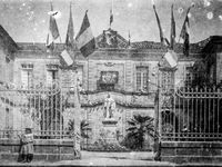 | Présentation du drapeau devant l'appartement Lacordaire en 1910