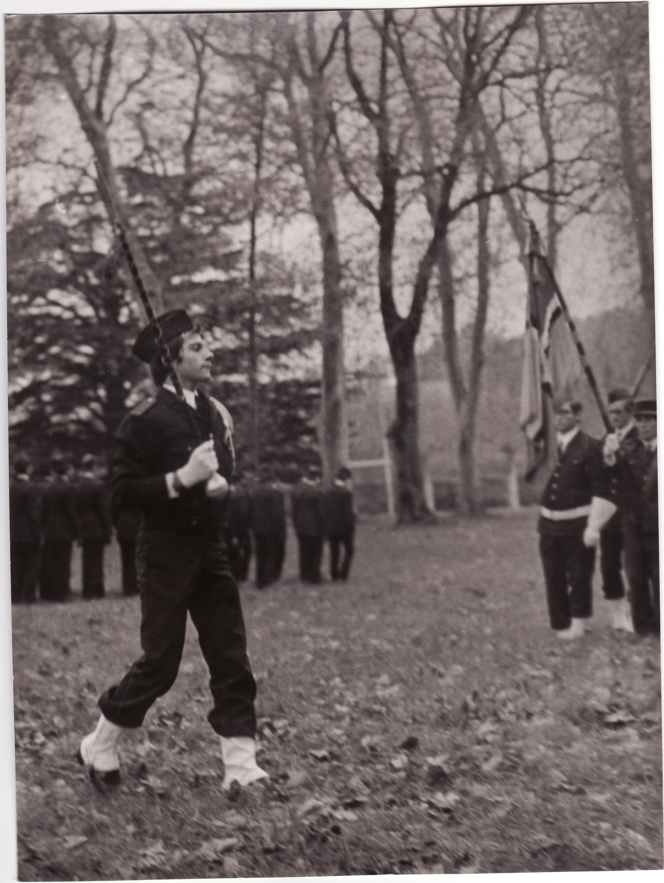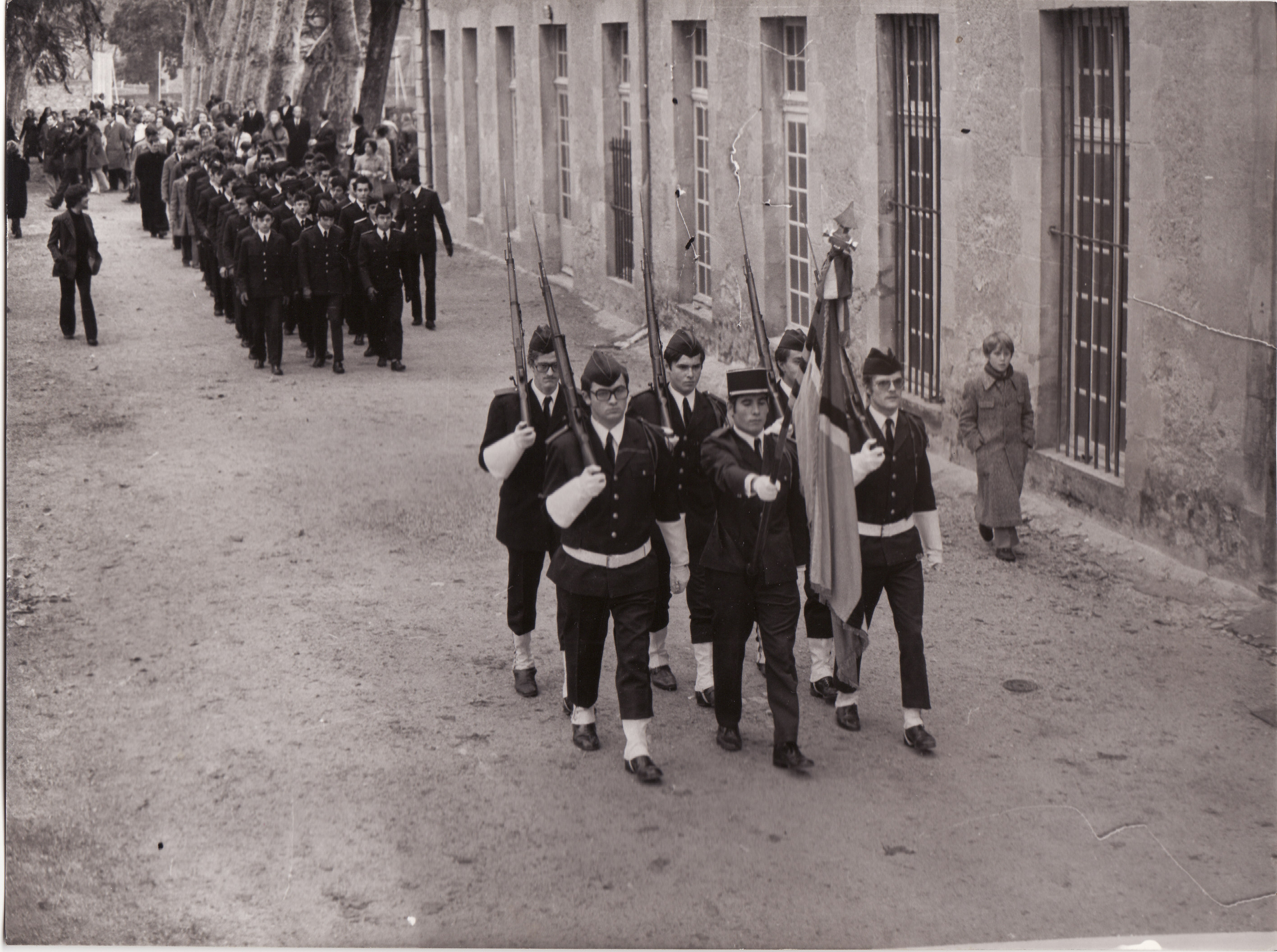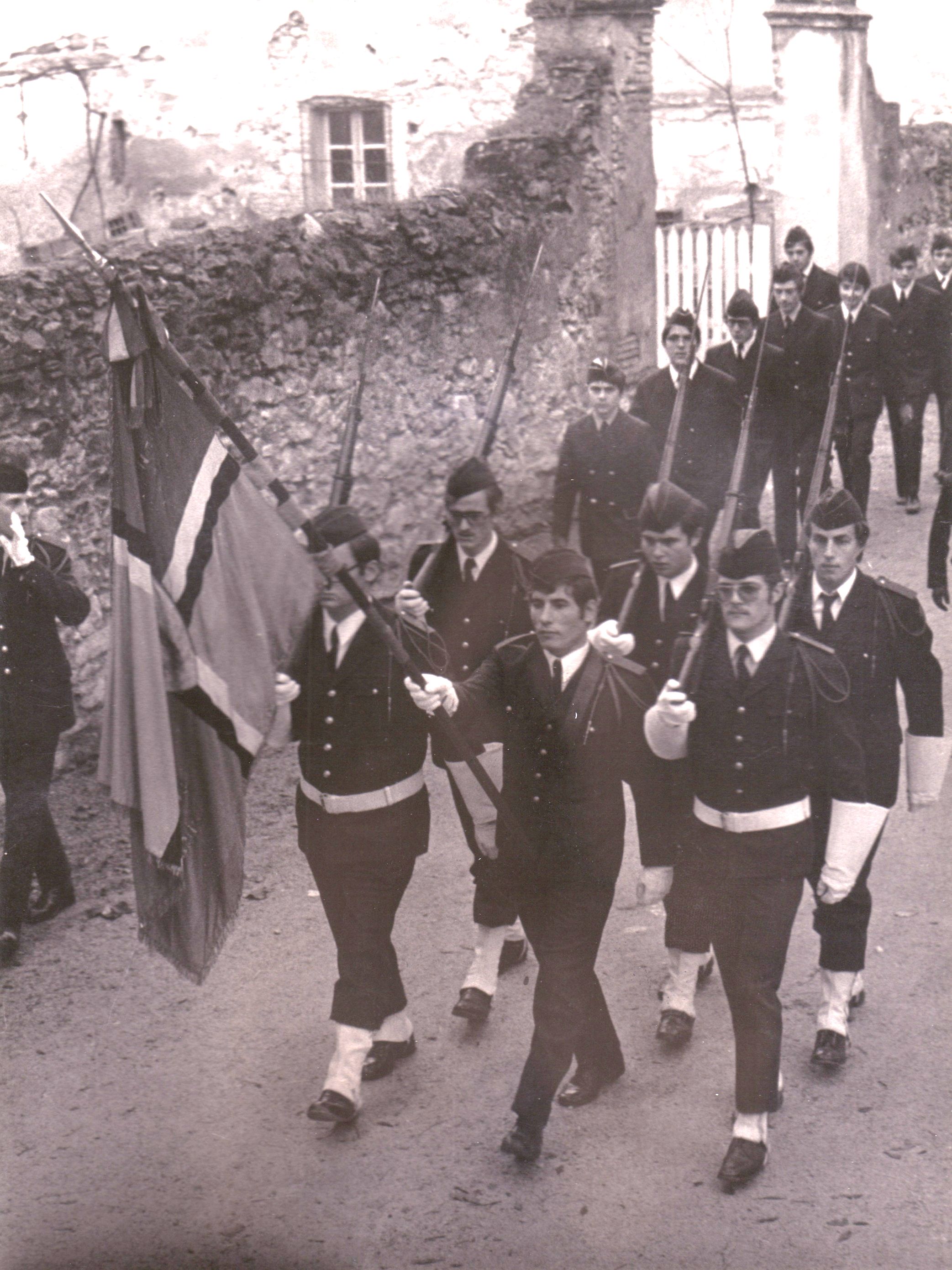 | 71, Sainte Cécile, l'état-major, de gauche à droite : Jean-Jacques Subiros, chef de fanfare, Jean-Edmond Sales, maître des cérémonies, Bernard Sudre sergent-major, Bernard Molinier, porte-drapeau