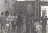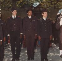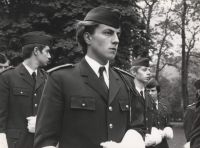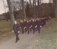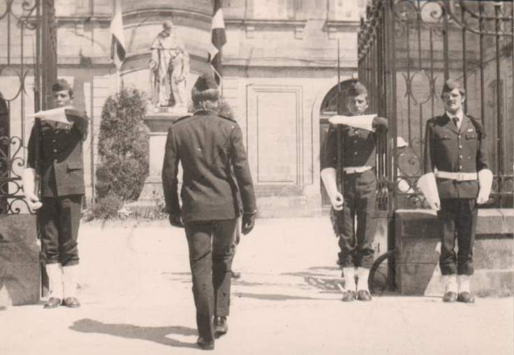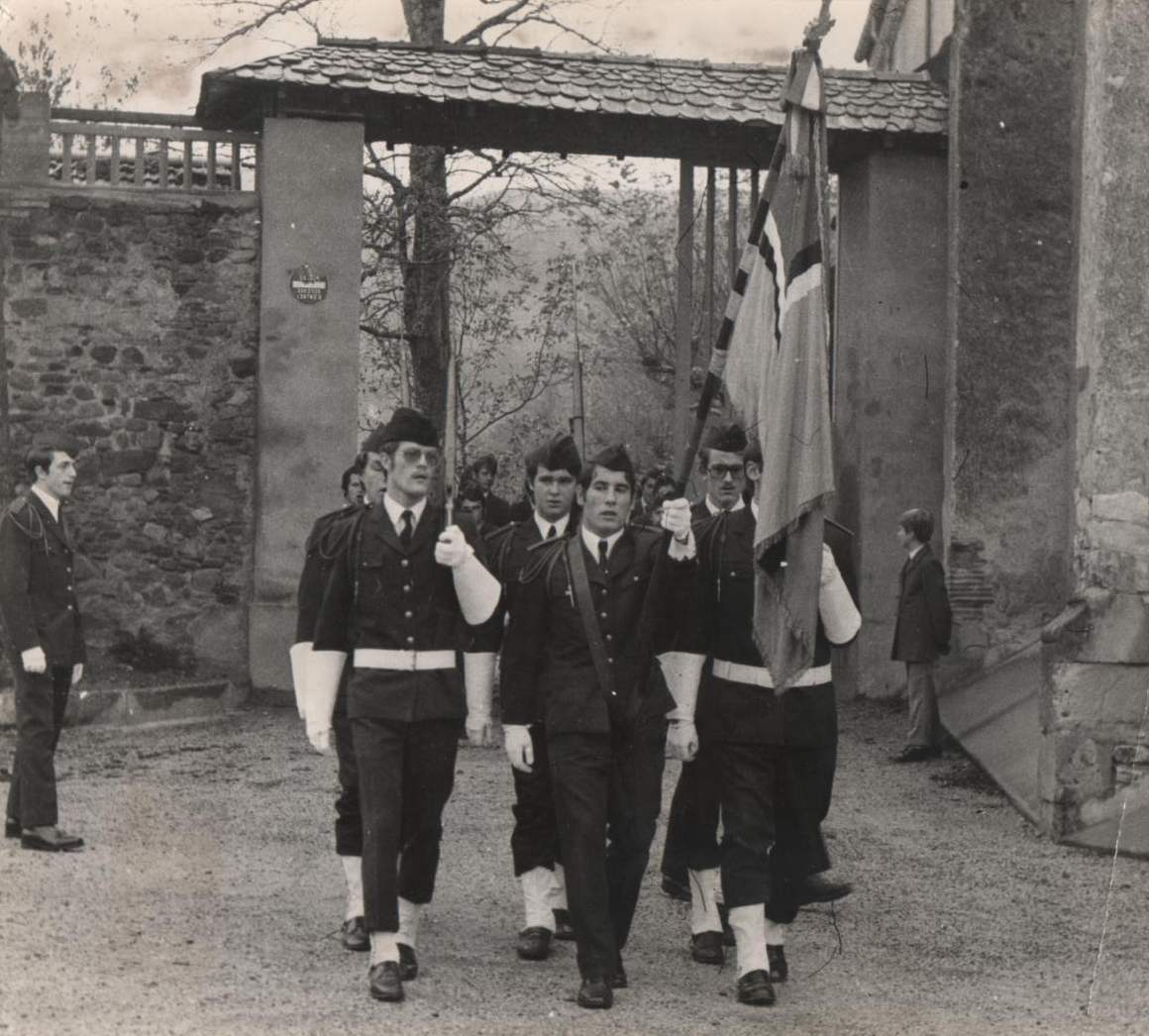 | ![]() 1973 Pentecôte, entrée cour d'honneur, Gilles DODEUR chef du Peloton, Philippe SAPPEY et Christian JEANNEROT. De dos Jean-Marc PEZET chef des Rouges