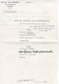 | ![]() 1973 septembre, annotations de SOMMAY... Pour les anciens de 73, Mr COULON n'avait pas apprécié le paté CANIGOU sur tranche de pain ! Et pourtant il avait fait DIEN BIEN PHU !
