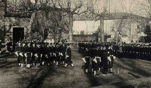 | ![]() Sainte Cécile 1960, | Dominique Mugnier, sergent d'honneur, Jean Laurent, sergent-major, le père Montserret, Gaston Bergasse, porte-drapeau, Louis Roy, maître des cérémonies ![]() Bergasse, Philippe Languillon, Michel Galibert, et François Ménard | au fond à gauche du drapeau Didier Campardou et, derrière Bergasse, Jacques Rougé, Jean-Louis Martinel, Xavier Flamand, Jean-Louis Desvilles ![]() Sainte Cécile 1960 | Prise d'armes dans la carrière ![]() Gabriel D'Arboussier remet le drapeau à Bergasse, sous l'oeil de Jacques Robin, président de l'Association Sorézienne