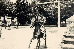 | ![]() La tribune d'honnneur. | Dominique Mugnier, le sergent d'honneur, est complètement à gauche; On aperçoit Luis Roy, le maître des cérémonies et le Père Dastarac, et au-dessous assis, Jean Laurent, le sergent-major, qui s'entretient avec Alain De Lestrade. Une personnalité africaine présidait ces fêtes, son excellence Alphonse BONI, Ministre de la Justice de Côte d'Ivoire, qui eut deux petit-fils à l'Ecole, l'évêque du Tarn. Parmi les parents, Mr de Mme De Lestrade, Léopold Delaude (25-35) et sa femme, parents de Bernard (53-62) et André (55-63), parlant avec Mme Meunier, mère d'Alain Meunier (54-62). Sur leur droite Monsieur (debout) et Mme Fabre (assise devant), parents de Maurice (55-63) et Alain (59-64). ![]() La tribune d'honnneur. | On aperçoit Mme Delaude (chapeau noir et blanc), Luis Roy, le maître des cérémonies, avec à sa gauche le Père Dastarac, Et au-dessous de lui, Alain De Lestrade qui regarde à droite. On aperçoit Charles d'Aragon et le Père Montserret derrière ce groupe, en-haut à gauche Au 2ème rang en partant du haut : Melle Delaude, Mme Delaude, Mme Mugnier, Léopold Delaude, Fabre Assis : Mme et Mr De Lestrade, Mme Boni, Mr Boni ministre de la justice de Côte d'Ivoire, l'évêque du TArn, le frère de Meunier © Photo de Bernard Rech de Laval ![]() Bergasse sur Vie dure | Pentecôte 1961. Concours hippique de Pentecôte. Gaston Bergasse sur « Vie Dure ». C'est un cheval que j'aimais particulièrement car il faisait des sauts de mouton, comme dans un rodéo. Il en a vidé plusieurs, mais j'adorais ses caprices et avais appris à les maîtriser, dit-il. ![]() Le Panier fleuri | c'est un des privilèges du grand prix d'équitation. Il s'agit d'attraper un bouquet de fleurs accroché à une potence pour l'offrir à une demoiselle de son choixà Un acte de chevalerie ! La demoiselle, dont je tairai le nom, a l'air d'apprécier ! Il y avait aussi beaucoup de curieux qui cherchaient à voir l'heureuse élue et beaucoup de demoiselles déçues. ![]() L'entraînement au Panier fleuri. Il me semble que c'était sur Ketty.