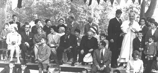 | ![]() Sainte Cécile 1960 | le drapeau (il faisait un très très véhément vent d'autan) 1er rang : Jacques Rougé, Gaston Bergasse, Xavier Flamand 2ème rang : Riba à droite ? ![]() Notre Etat Major a géré les festivités du « Centenaire de la mort du Père Lacordaire », dont j'ai retrouvé la description de la fête de la St Cécile, le 21 novembre 1960. Certaines des photos s'expliquent : | -L'état Major a été nommé auparavant, peut être la veille. Mon père me remet le drapeau le 20 novembre .. -L'attente dans la cour d'honneur est pour la réception de toutes les personnalités décrites dans le fascicule ci-joint, en page 1 et 2 -Le lever aux couleurs entre Louis XVI et l'obélisque -Un discours dans la salle des bustes « Pourquoi Lacordaire est-il venu à Sorèze » -La messe -Un repas (lecture d'une lettre de Son Excellence H.OUEDRAOCO, Ministre de Haute-Volta et Maire de Ouagadougou ! Avez-vous la réponse pourquoi lui ?), plusieurs orateurs anciens élèves, puis le préfet pour clôturer la journée ! ![]() Pentecôte 1961 | Le programme ![]() Pentecôte 1961 | ![]() Pentecôte 1961 | ![]() Pentecôte 1961 | Le menu du banquet ![]() Repas des anciens à la Sainte Cécile 1960, dans le réfectoire des pères : | Louis Bergasse avec ses lunettes, à côté du père Dastarac, René Pagès, l'oncle de Bruno et d'Henri, et Jacques Robin, en face, Gaston, Yves Bergasse, son père, 3eme sur sa droite, frisé, Et Gaston, bien sûr, de profil au premier plan ![]() Pentecôte 1961 | Repas des anciens, Henri Pagès, Bernard Delaude (avec des lunettes noires), Pierre-Jean Seignez. ![]() X, Laurent, Michel Galibert, puis Roy et Bergasse